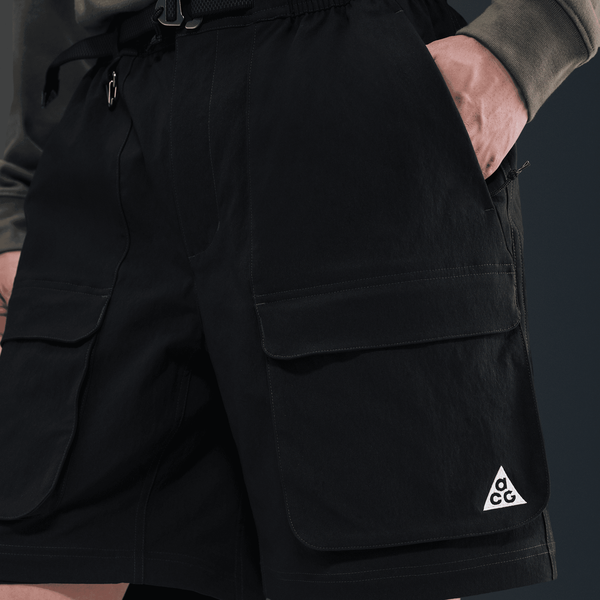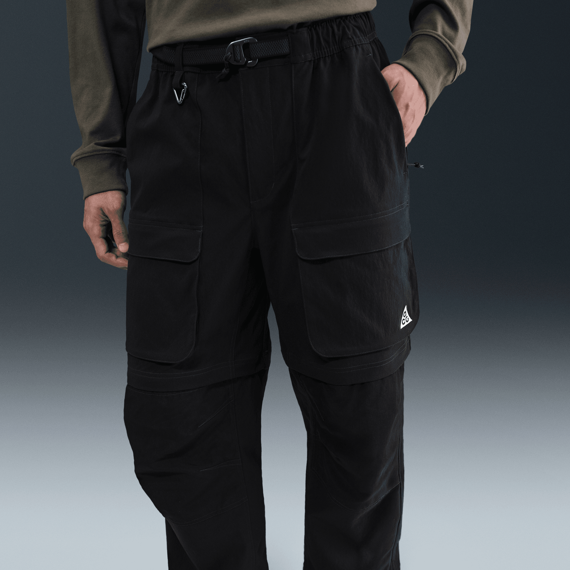 Hand pockets and spacious cargo pockets are equipped with zippers to secure your essentials. An elastic waistband, webbing belt and quick-release buckle create a secure, comfortable fit. An ACG tribiner attaches at the waistband loop.
