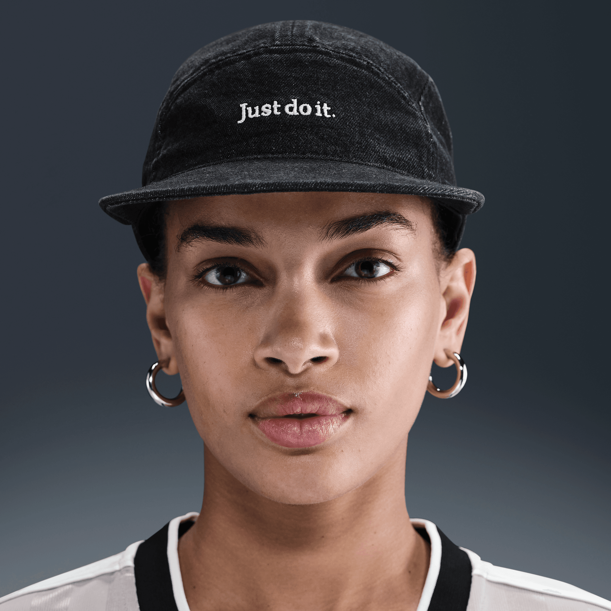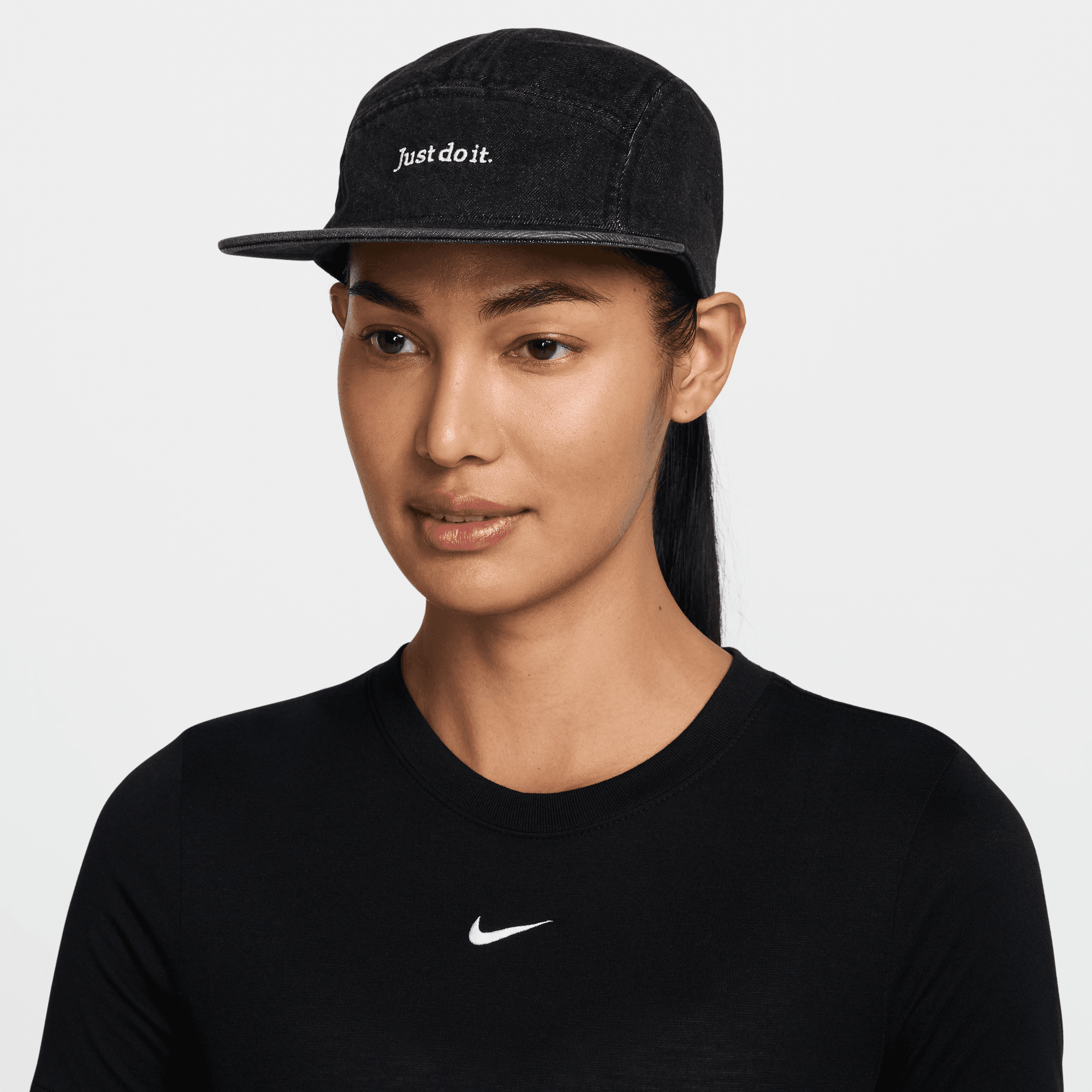The soft washed denim of this cap is embroidered with a "Just Do It" emblem. Fly caps all have a snug and athletic fit with a low depth.